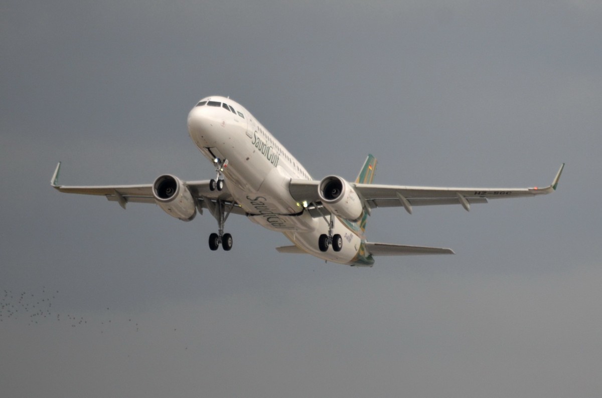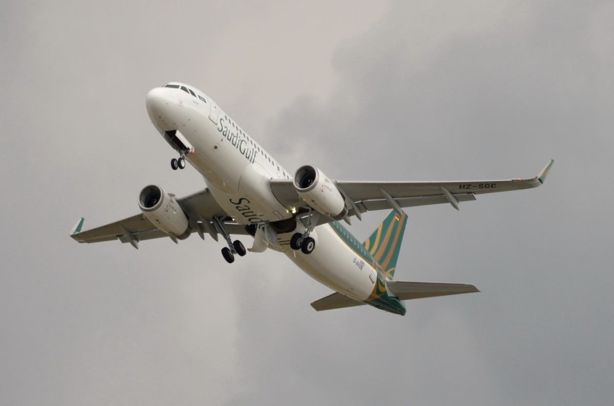SaudiGulf Airlines Airbus A320-200 , deutsche Kennung D-AVVN , Landes Reg. Nr HZ-SGC , Produktions Nr 6583 , in H.-Finkenwerder beim Start 18.06.2015