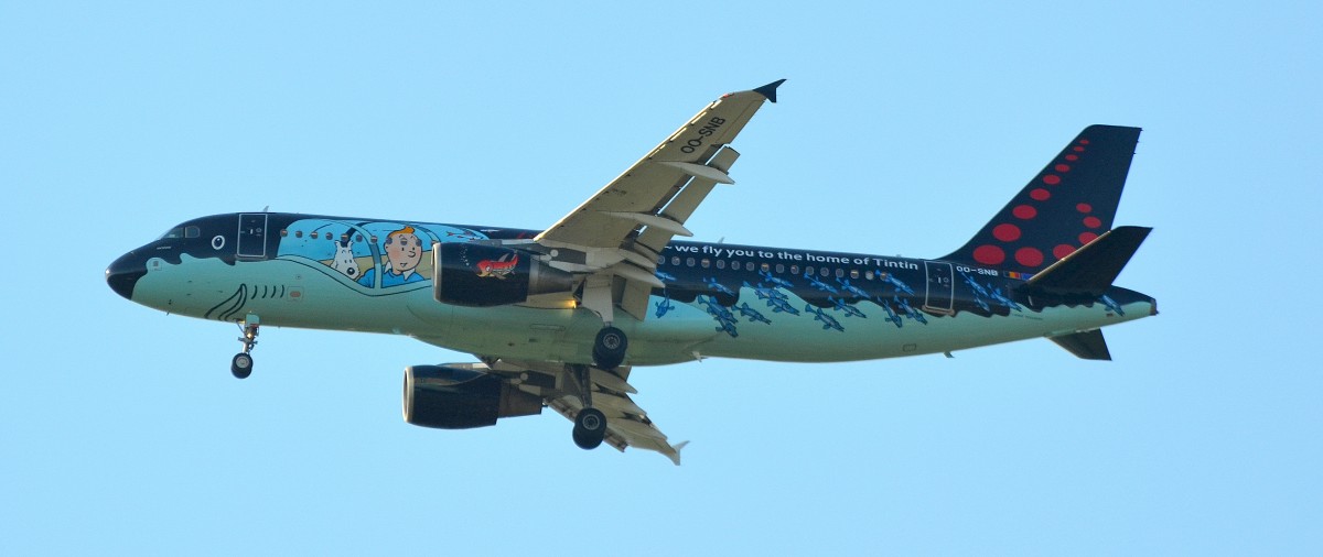 Der Brussels Airlines Airbus A320 OO-SNB mit dem Taufnamen Rackham im Anflug auf Hamburg Fuhlsbüttel überfliegt mein Wohnhaus in Poppenbüttel am 07.06.15 er stellt das Haiförmige U-Boot aus dem Tim und Struppi Album Der Schatz Rackhams des Roten dar.