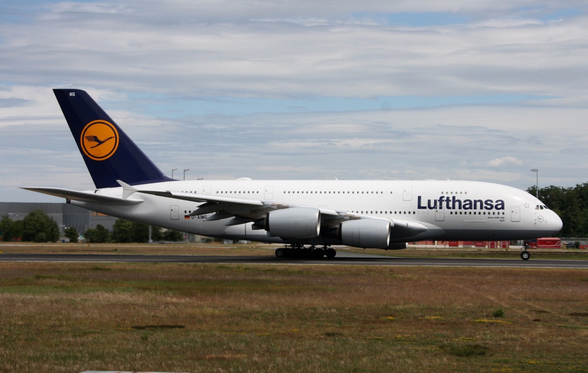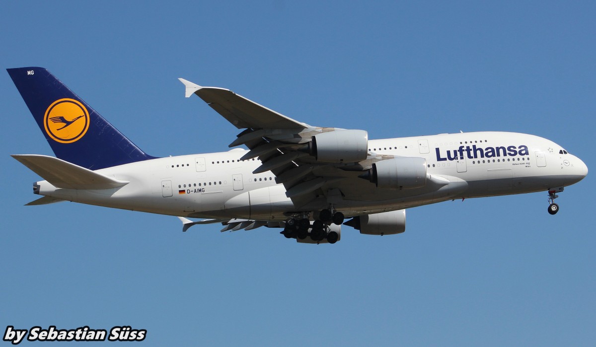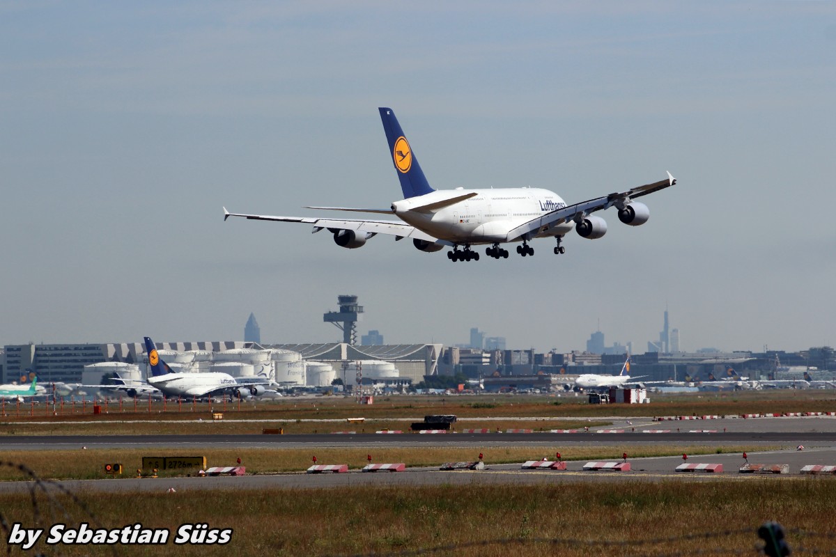 LH A380 D-AIMC arrives at Frankfurt after a long flight from Houston. 5.6.15