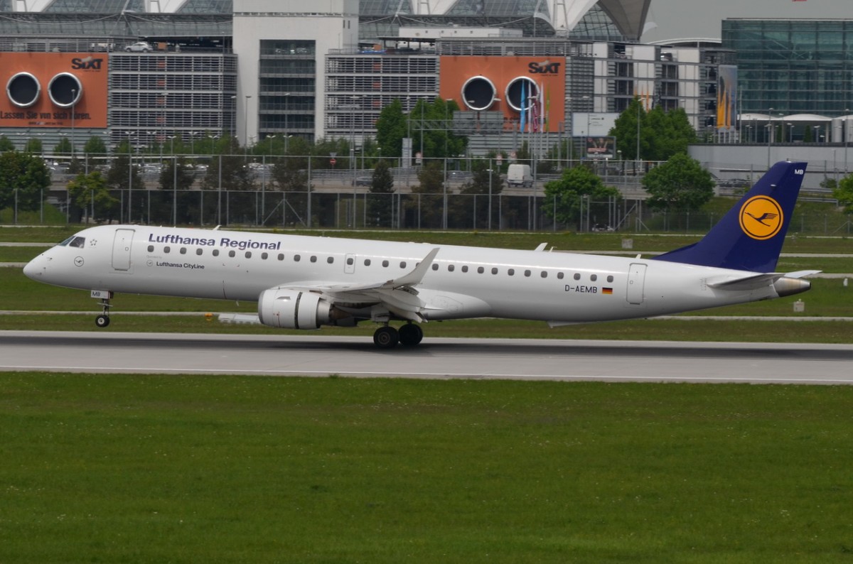 D-AEMB Lufthansa CityLine Embraer ERJ-195LR (ERJ-190-200 LR) in München bei der Landung am 12.05.2015