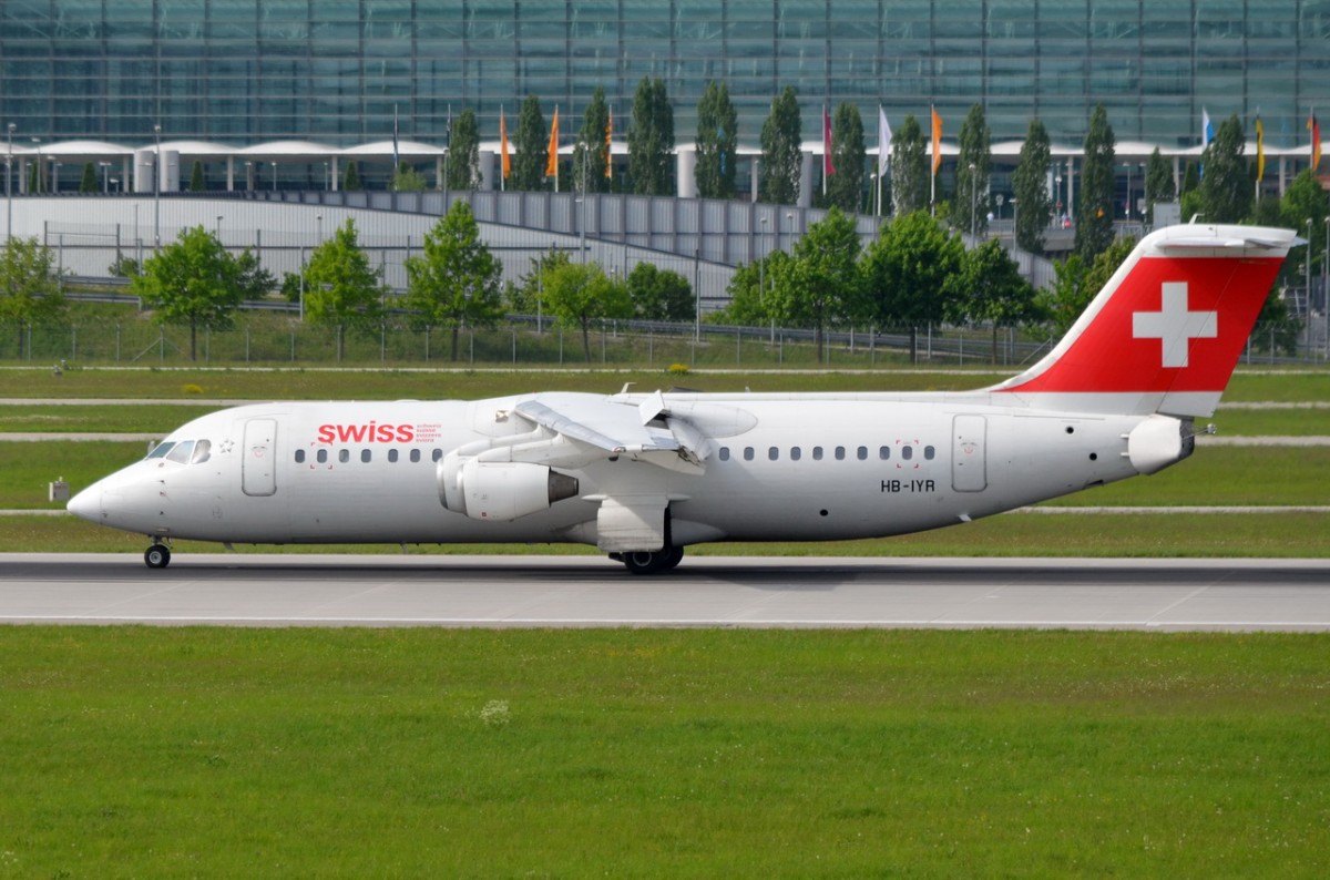 HB-IYR Swiss British Aerospace Avro RJ100 in München vor dem Start am 12.05.2015