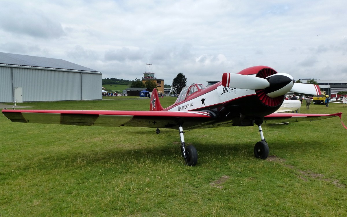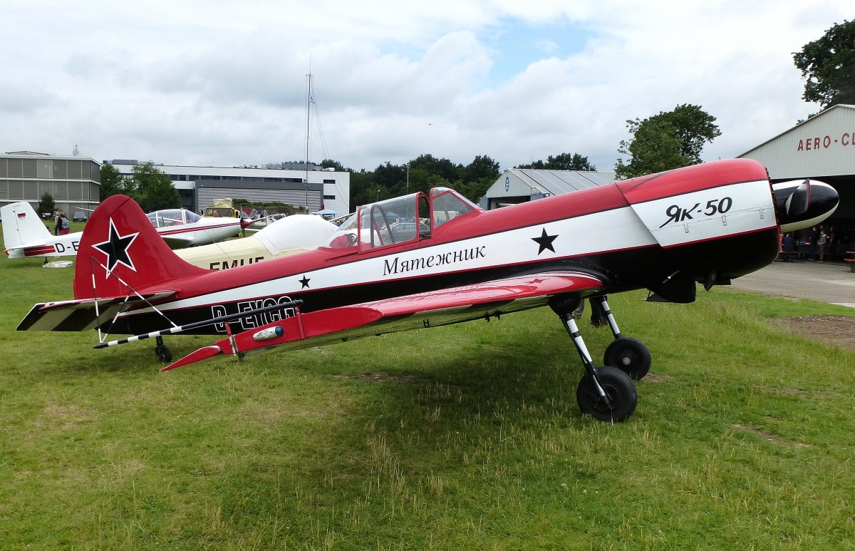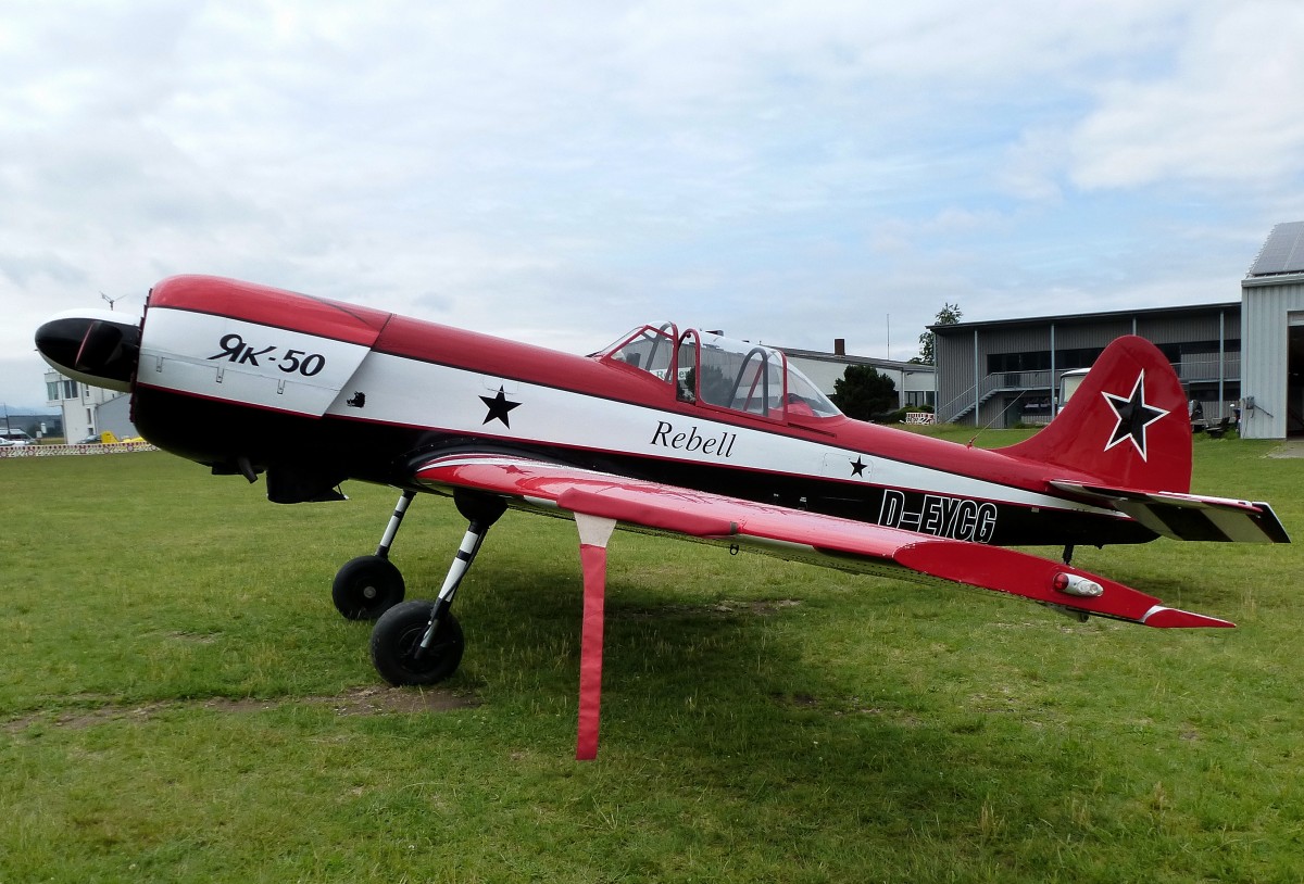 Yak 50, Kennung D-EYCG, sowjetisches Sportflugzeug, gebaut ab 1975, Vmax.420Km/h, Flugplatz Freiburg, Juni 2015
