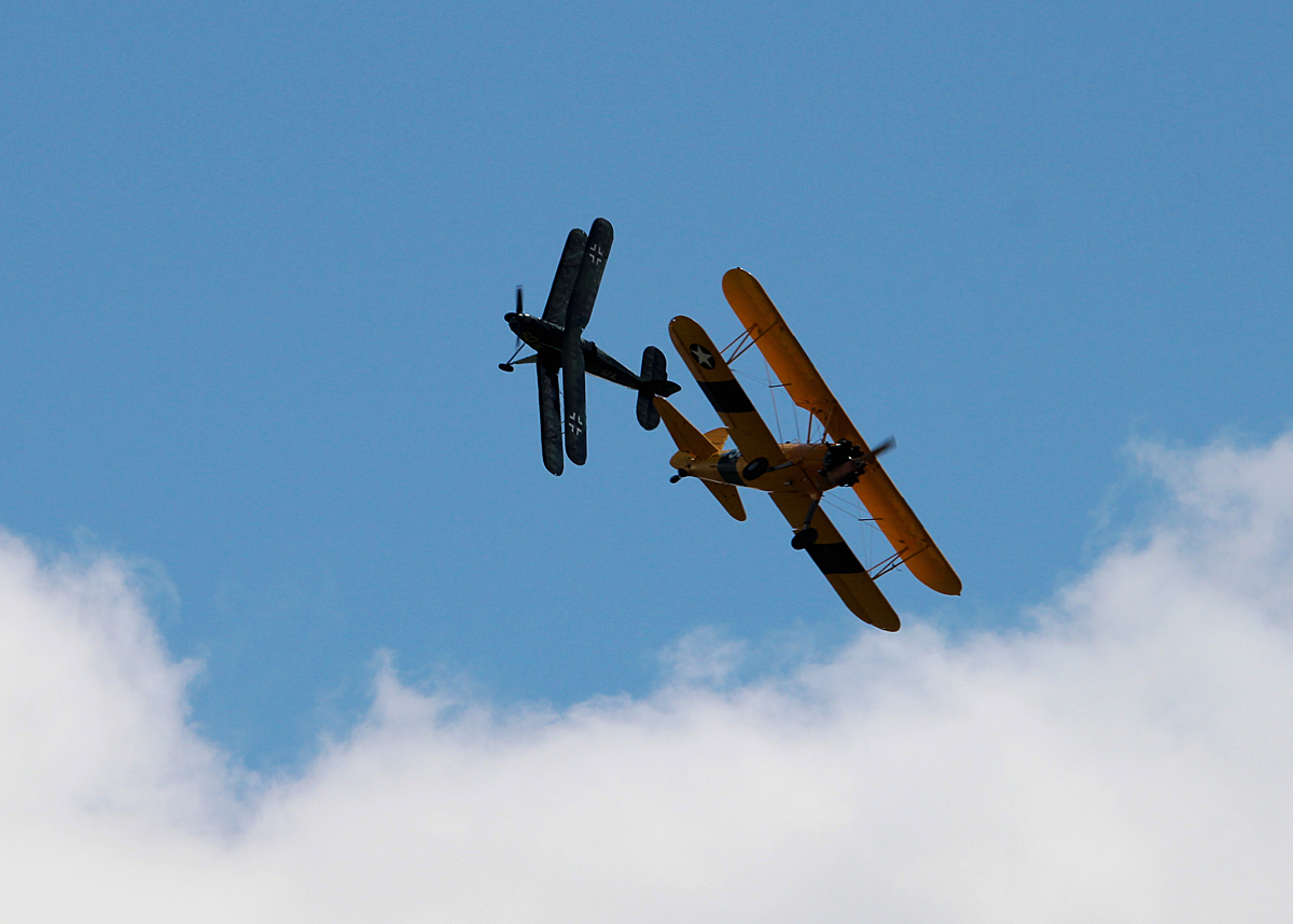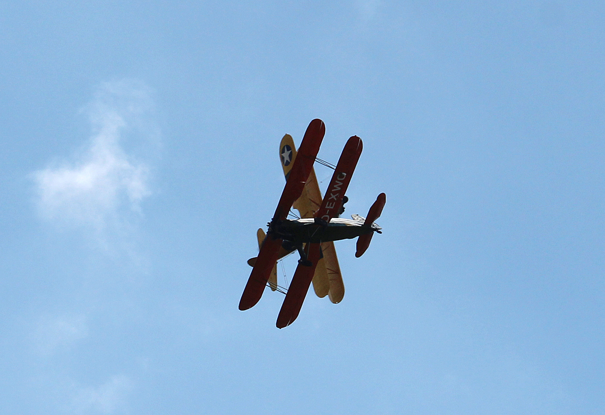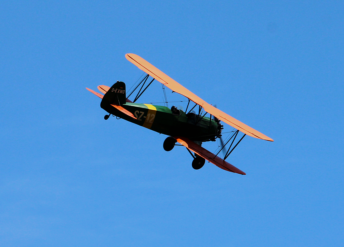 Focke-Wulf FW-44J Steiglitz D-EXWO und Boeing A75N1 Stearman N3972U am 28.06.2015 über dem Flugplatz Strsuebrg