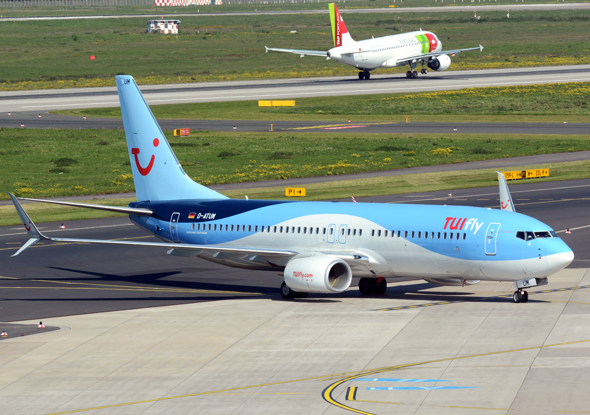 B 737-800 Tuifly, D-ATUM, taxy at DUS. Im Hintergrund landet eine A 319-111 der TAP - DUS 01.10.2015