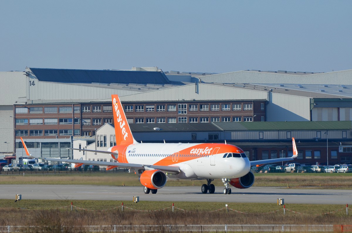 Der Easyjet Airbus A320 Werkskennung D-AUBO beim rollen zum Start in Hamburg Finkenwerder am 16.02.16