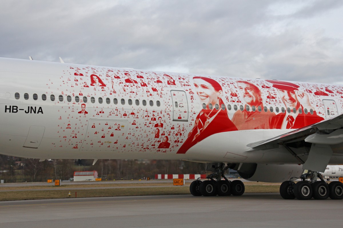 SWISS Global Air Lines, HB-JNA, Boeing B777-3DEER, "Faces of SWISS", 8.Februar 2016, ZRH Zürich, Switzerland. Detailansicht der Portraits.