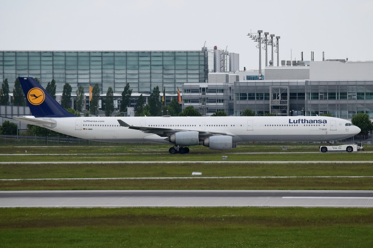 D-AIHH Lufthansa Airbus A340-642 "Wiesbaden" am 17.05.2016 in München unterwegs zum Gate