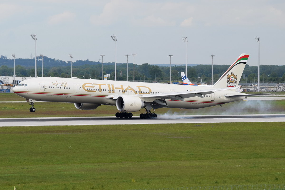 A6-ETR Etihad Airways Boeing 777-3FX(ER) bei der Landung am 20.05.2016 in München