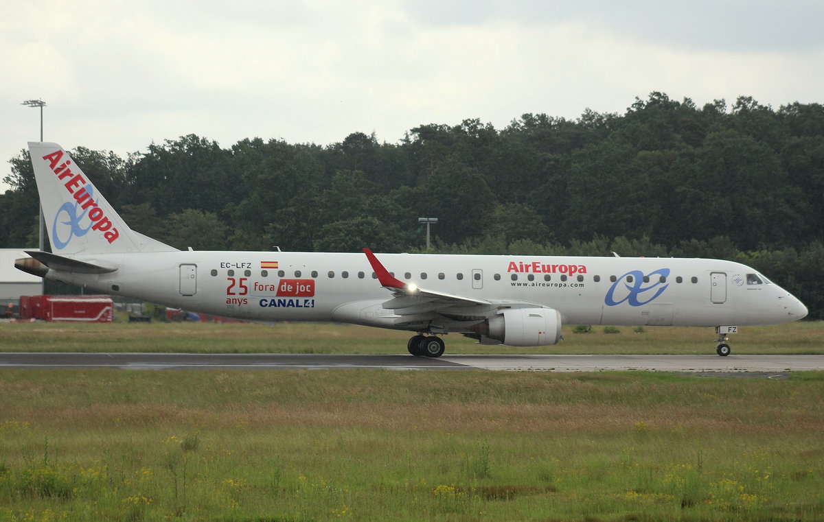 Air Europa,EC-LFZ,(c/n 19000357),Embraer ERJ-195-200LR,14.06.2016,FRA-EDDF,Frankfurt,Germany(Sticker:25 anys fora de joc CANAL4)