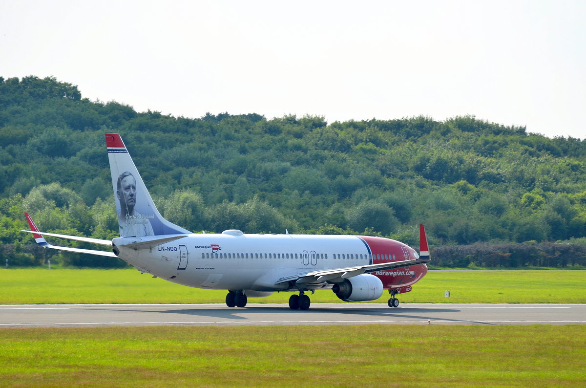 Norwegian Boeing 737-800 LN-NOO beim Start in Hamburg Fuhlsbüttel am 22.06.16 den Heckflügel der Maschine ziert Gustav Vigeland der wohl bedeutendste Bildhauer Norwegens.