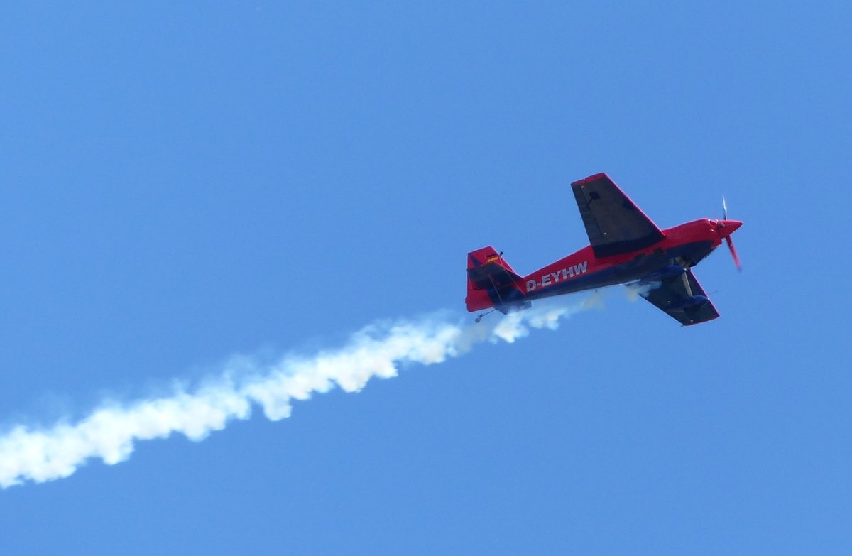 Kunstflieger im Eigenqualm. "Mike Rottland" bei Kunstflugvorführung mit seiner Extra 300 S D-EXMR am UL-Flugplatz Müggenhausen - 13.08.2016