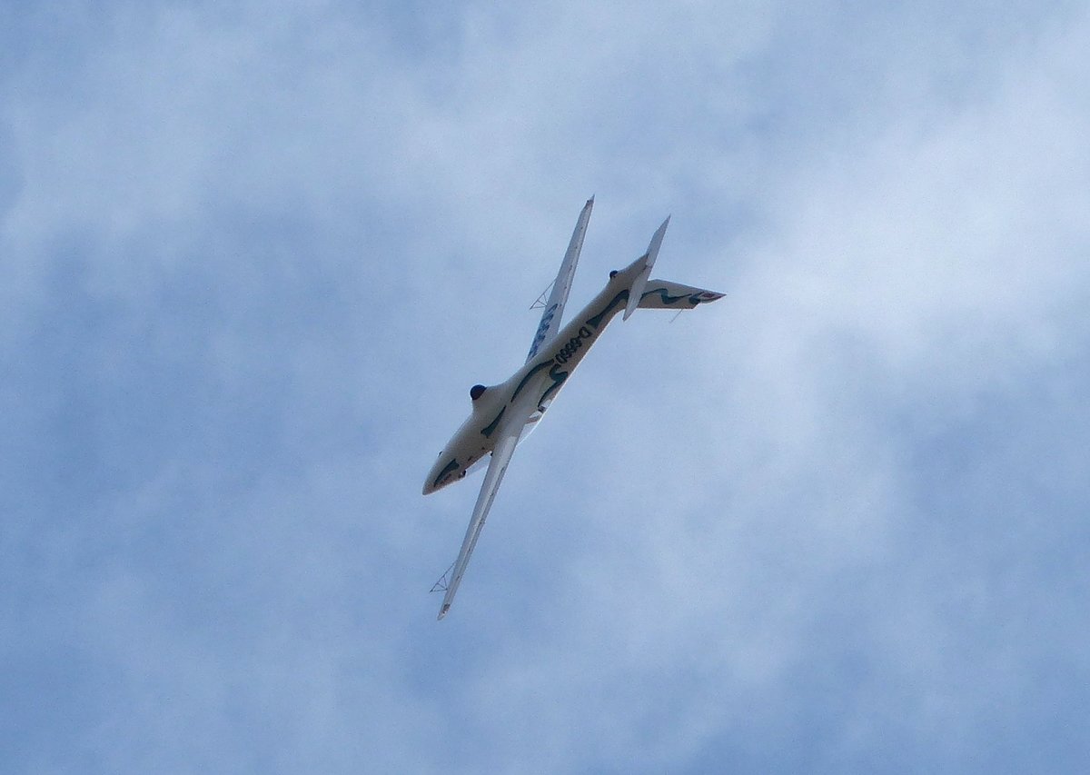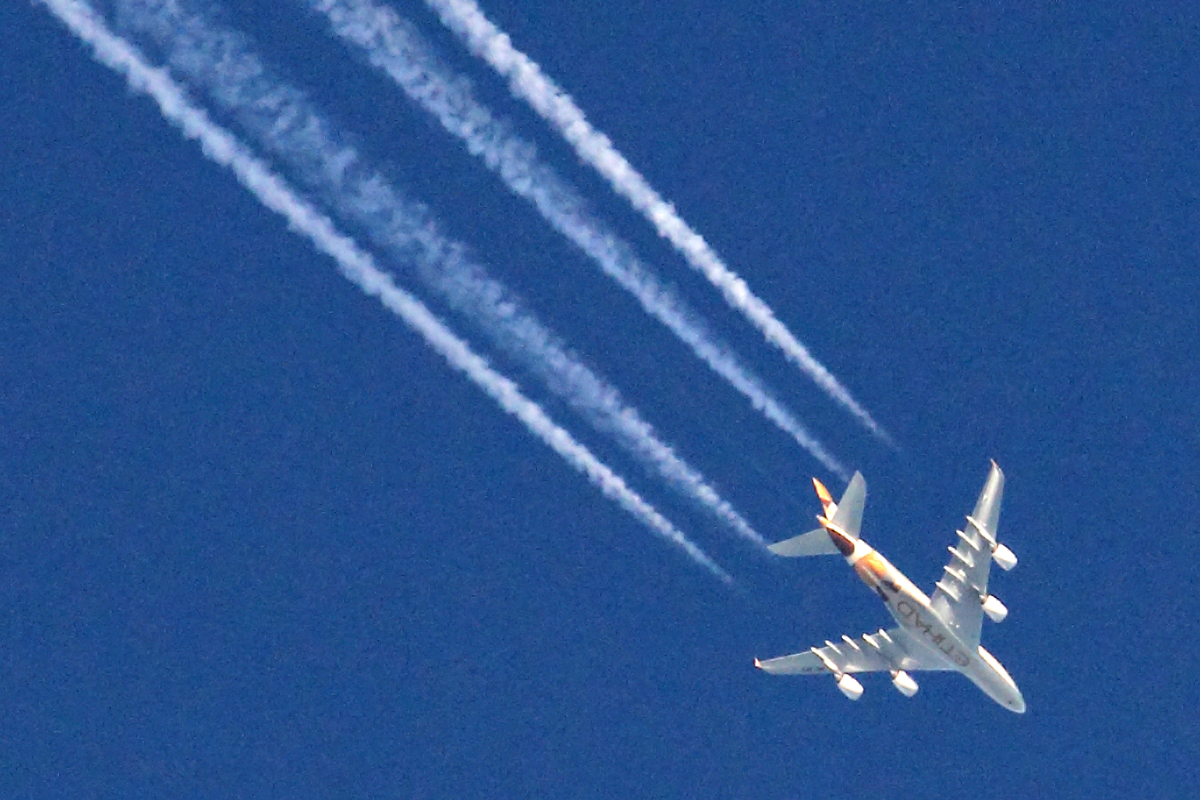 Etihad Airbus A380-861 A6-APF überfliegt Düsseldorf auf dem Weg nach London 13.9.2016