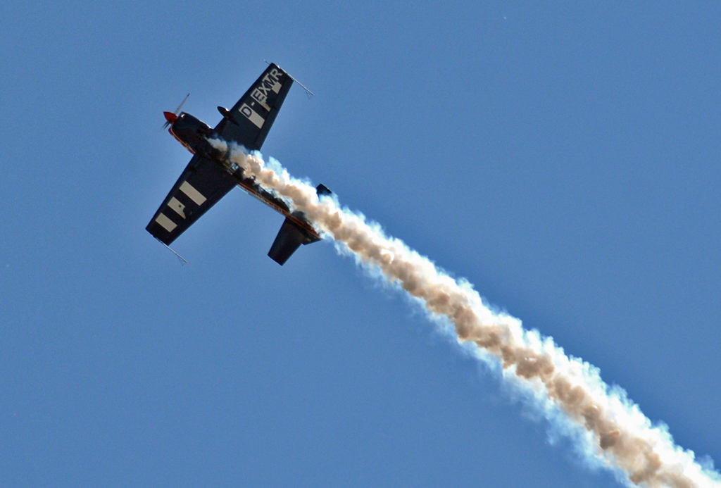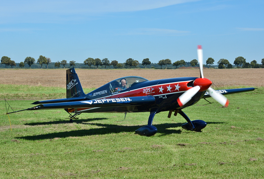 Mike Rottland bei der Kunstflugvorführung mit seiner Extra 300 S, D-EXMR, am UL-Flugplatz Müggenhausen - 13.08.2016