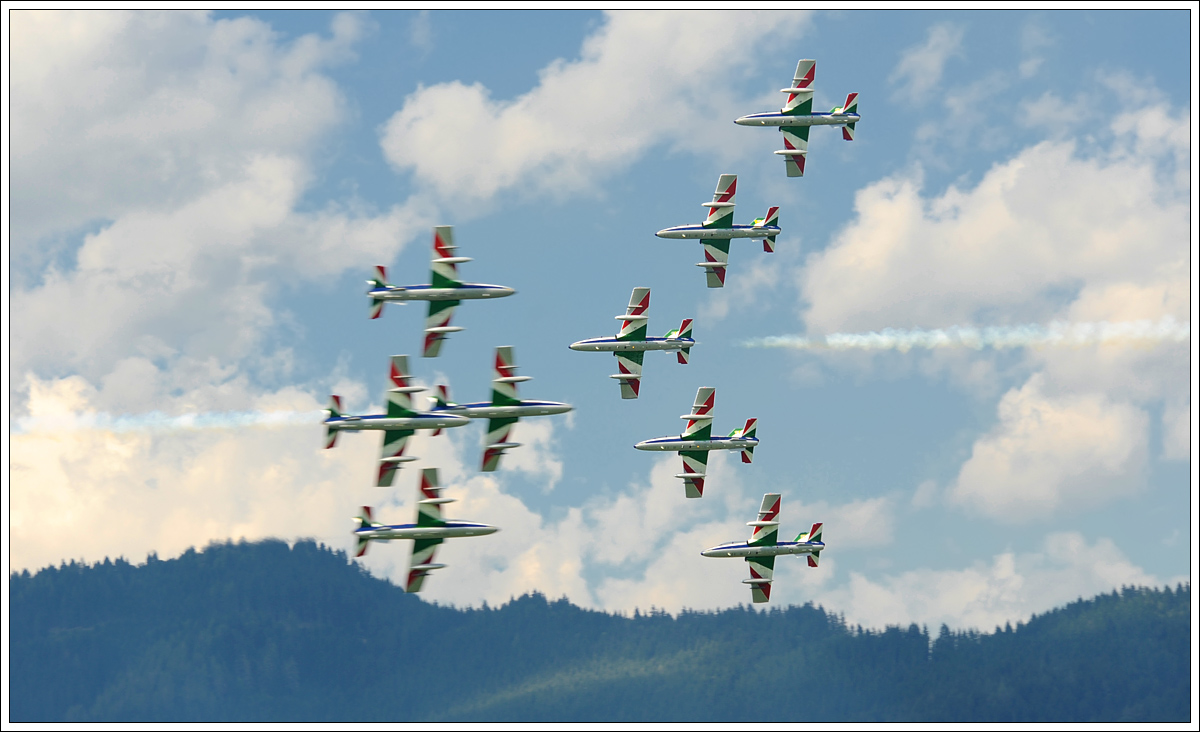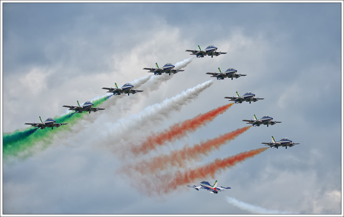 Das Foto war zwar so gewollt, dennoch ist so eine Aufnahme meiner Meinung nach immer ein bisschen ein Glückstreffer. Frecce Tricolori mit ihren zehn Aermacchi MB-339 PAN bei der Flugfigur "Tunnel", wo der Solopilot mit hoher Geschwindigkeit durch den Rauchteppich seiner Kameraden sticht. Airpower16 in Zeltweg am 2.9.2016.