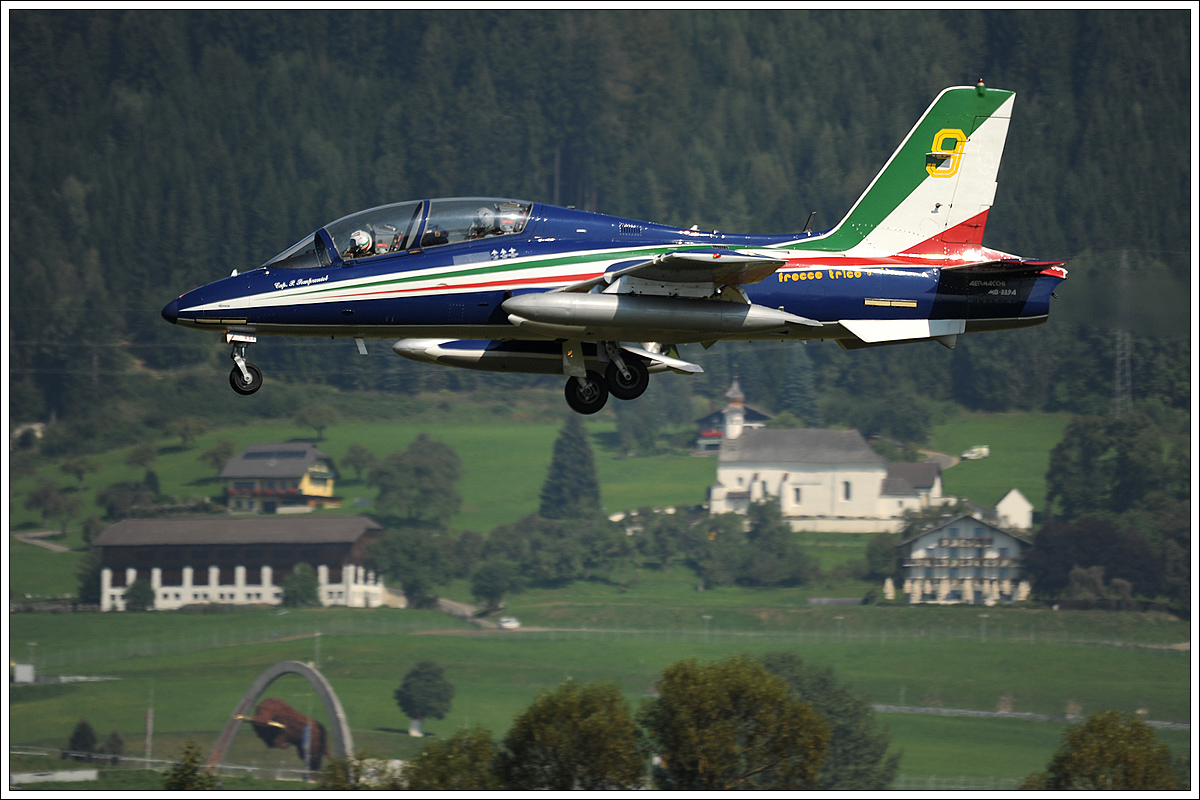 In Zeltweg hat man teilweise die Möglichkeit einer gewissen Bildgestaltung, so wie hier bei der Landung der Aermacchi MB-339 PAN Nr. 9 der FRECCE TRICOLORI am 1.9.2016. Kurze Zeit später begannen die Frecce dann mit ihrem Trainingsprogramm für die Airpower16.