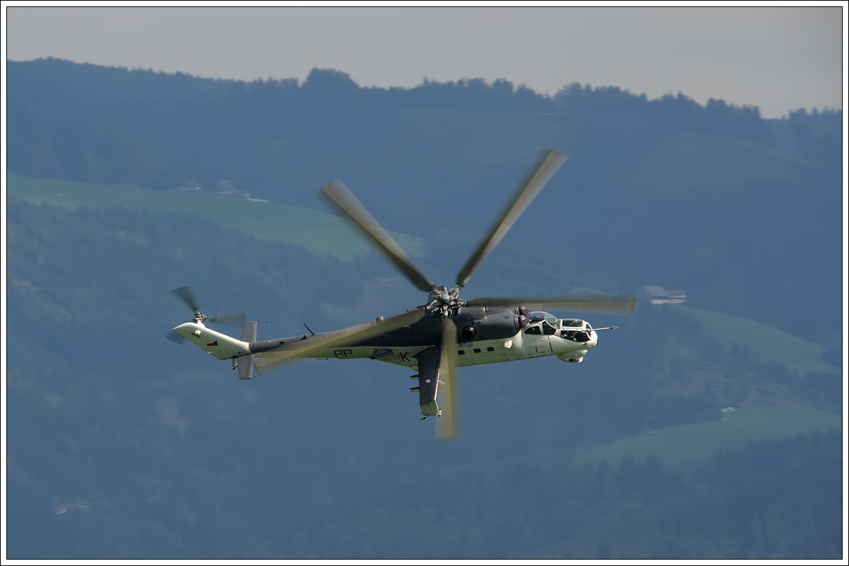 Mi-35 der tschechischen Luftwaffe (3370), einer modernisierten Version des Mi-24V, beim Training für die Airpower16 am 31.8.2016 in Zeltweg. Die sehr hohe Belichtungszeit von 1/160 macht es möglich, dass die Rotorblätter unscharf werden. Nachteil - viele Fotos werden in so einem Fall unscharf.