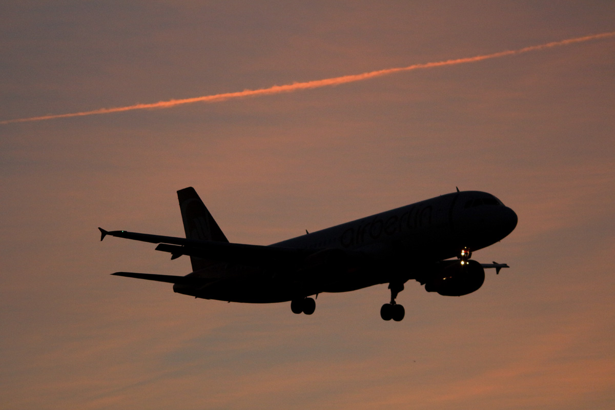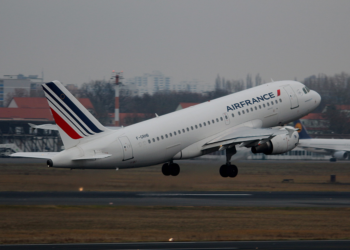 Ein Air France Airbus A319 kurz vor der Landung auf dem Flughafen Düsseldorf. Die Bahnstrecke Düsseldorf-Duisburg nördlich der Station Düsseldorf/Flughafen unterquert hier das Ende einer der Start- und Landebahnen.