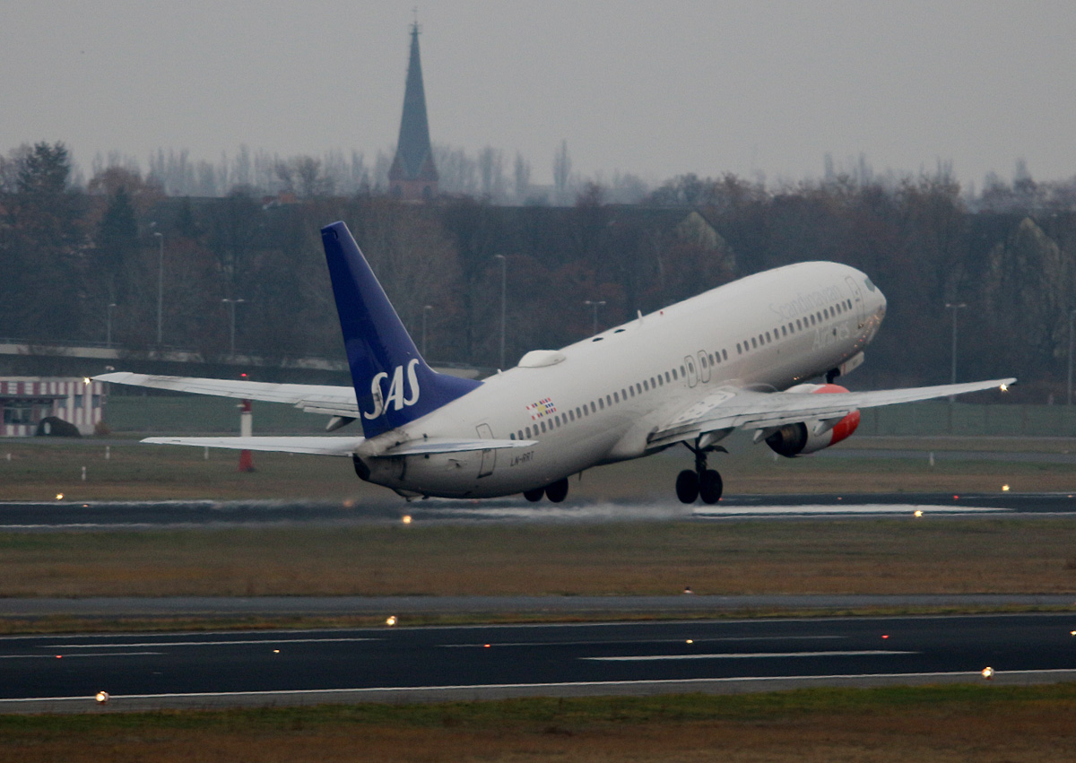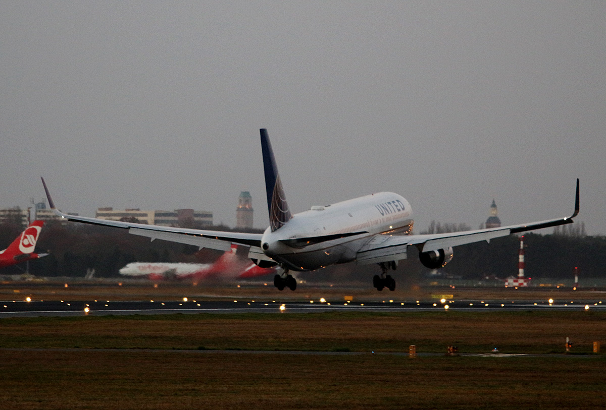 Eine Condor 757-300 D-ABOK(?), beim Start in Richtung Westen auf der leicht ansteigenden Startbahn des Stuttgarter Flughafens.