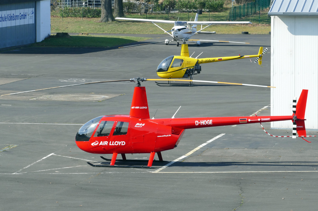 R 44 Raven II D-HOGE und R 22 Beta D-HALW, beide FA. AirLloyd vor der Air Lloyd-Halle in EDKB - 13.03.2017