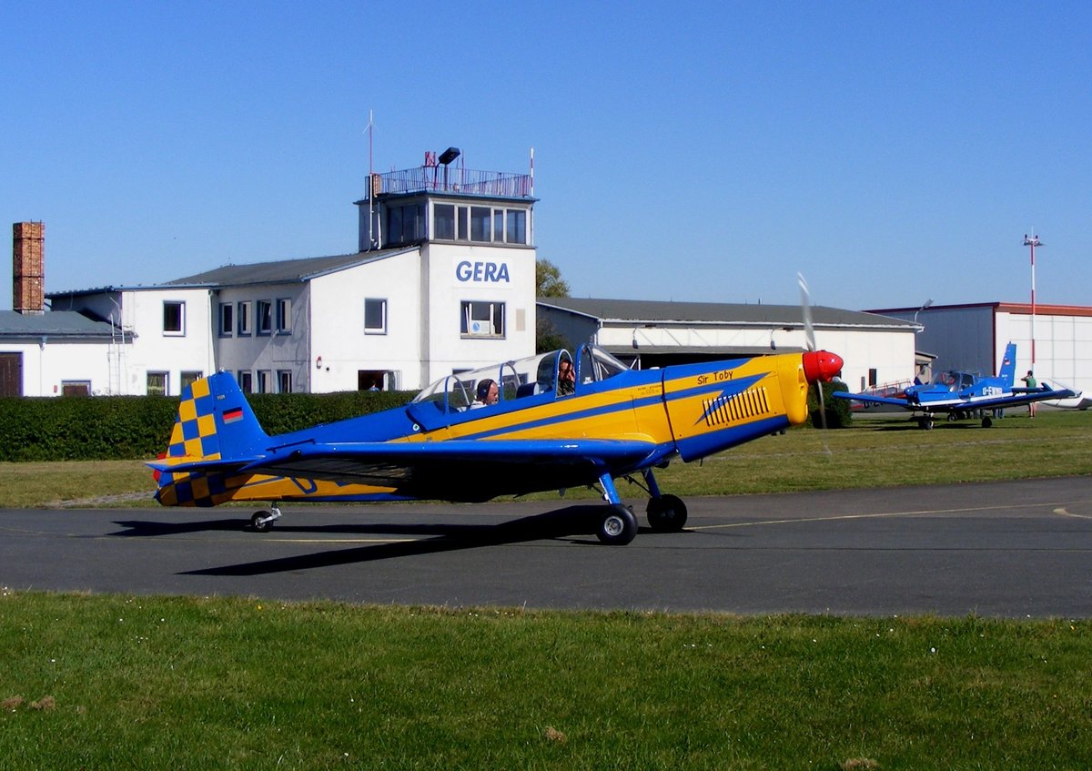 Zlin 526F, D-EXBA auf dem Weg zum Start am 1.10.2011 in Gera (EDAJ). Im Hintergrund der alte Tower, der im Juni 2017 abgerissen wurde.