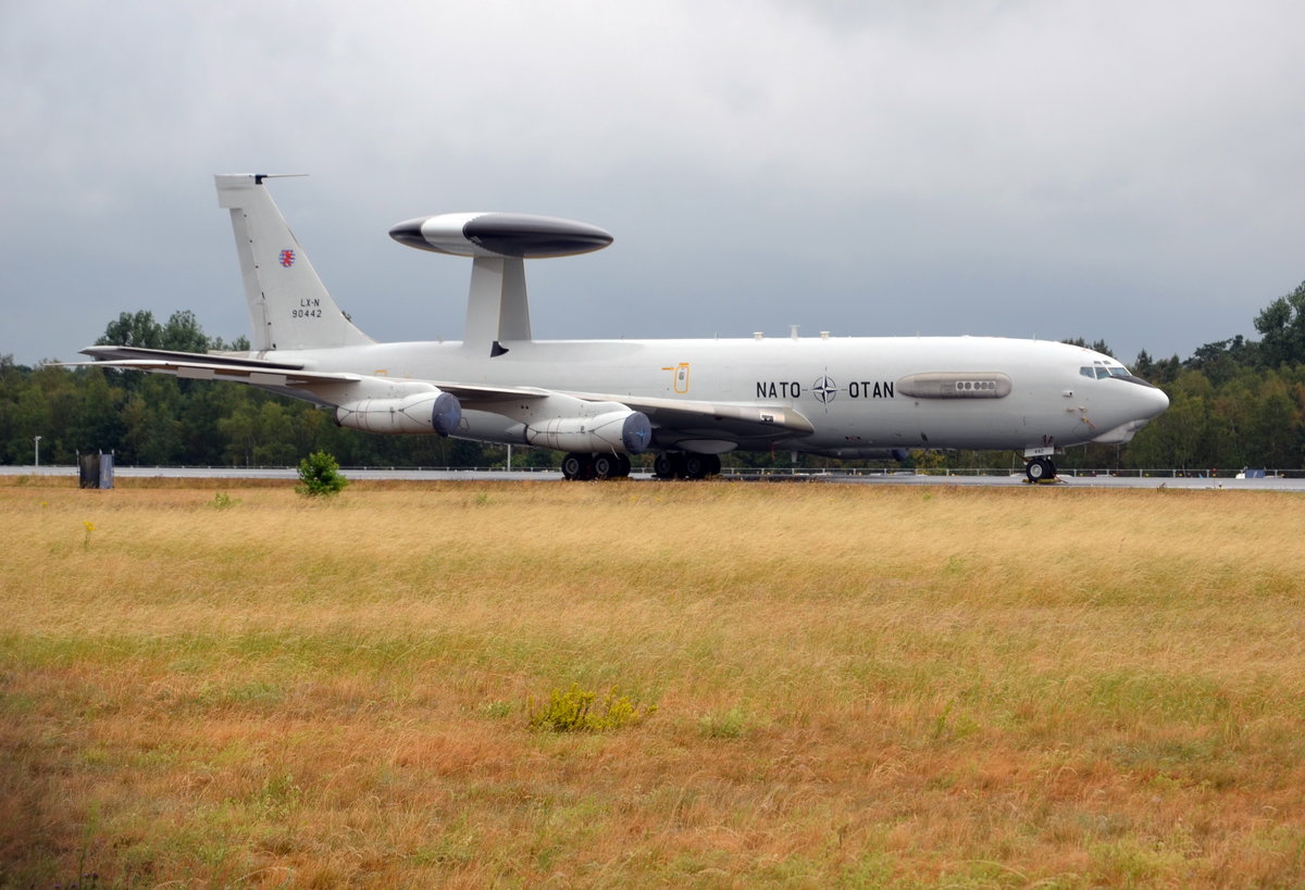 AWACS LX-N 90445, einer der beiden Einsatzverbände der NATO-Frühwarnflotte eine Maschine von 16 steht auf dem Rollfeld der Nato Air Base in Geilenkirchen. Boeing E-3 Sentry ist die militärische Bezeichnung für eine Boeing 707-320, die als AWACS-Luftaufklärer unterwegs ist. Am 01.07.2017