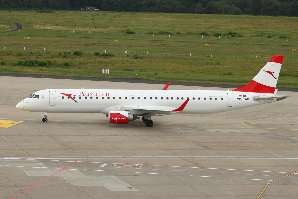 Austrian Airlines, OE-LWF, Embraer ERJ-195LR. Gestartet in Köln-Bonn (CGN/EDDK) zum Rückflug nach Wien (VIE) am 16.07.2017.