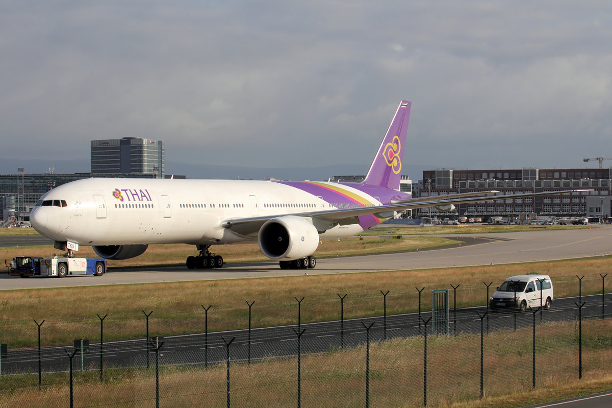 Thai Airways Boeing 777-3D7ER HS-TKV wird zur Abstellposition in Frankfurt geschleppt 7.6.2017