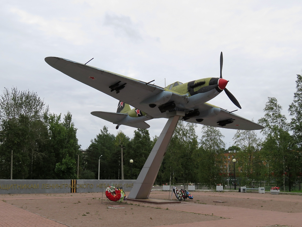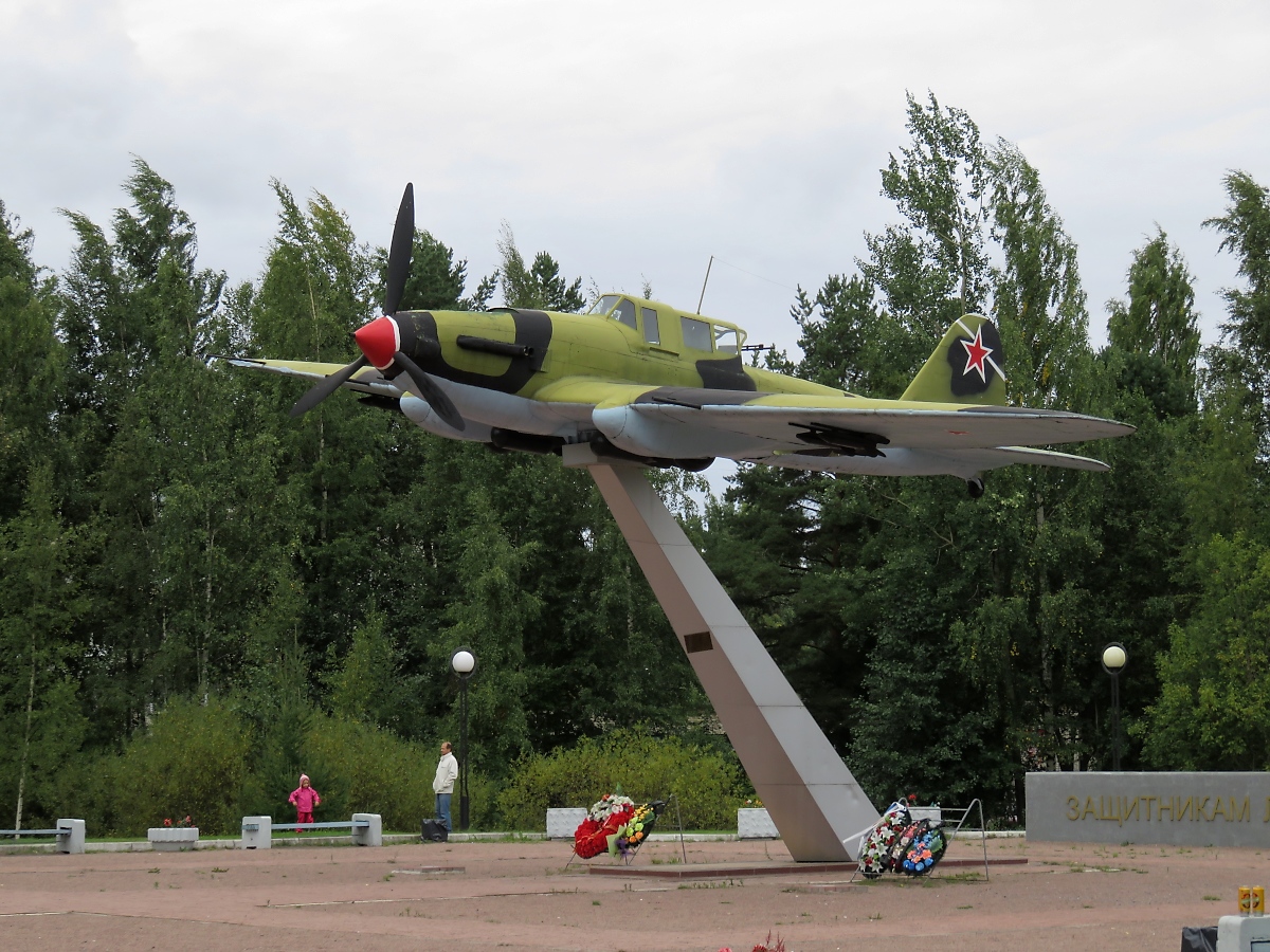 Ausgestelltes russisches Kampfflugzeug vom Typ Iljuschin Il-2 auf dem "Monument to the Defenders of Leningrad Sky" (Памятник Защитникам Ленинградского Неба) in Lebyazhye, 3.9.17