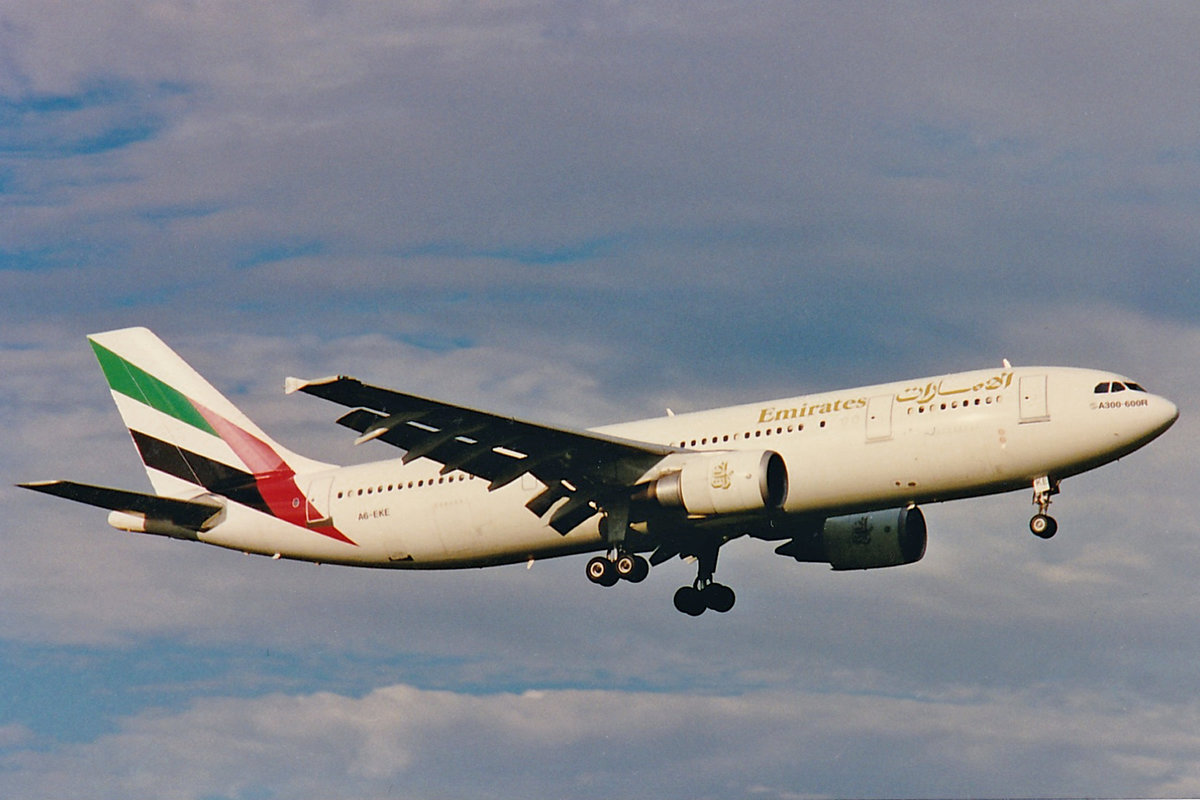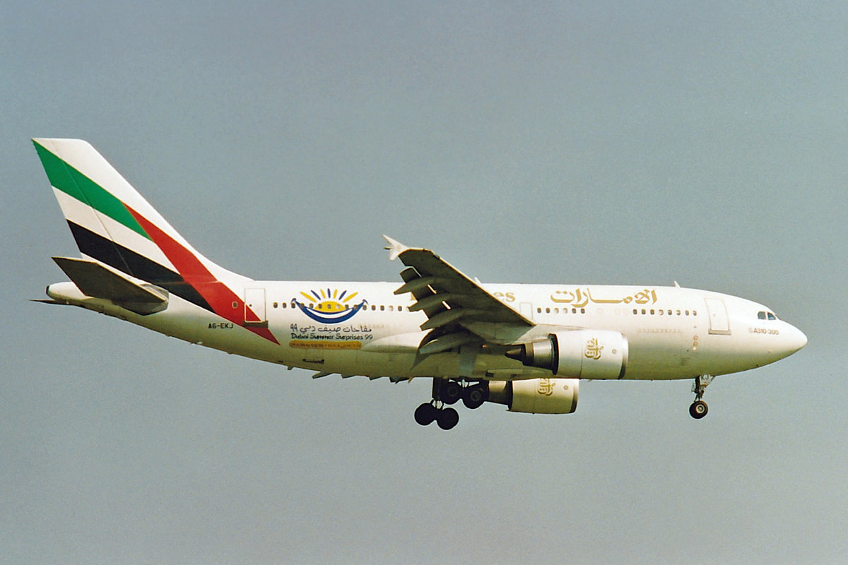 Emirates Airlines, A6-EKJ, Airbus A310-308, msn: 597, September 1999, ZRH Zürich, Switzerland. Sticker "Dubai Summer Surprises 99". Scan aus der Mottenkiste.