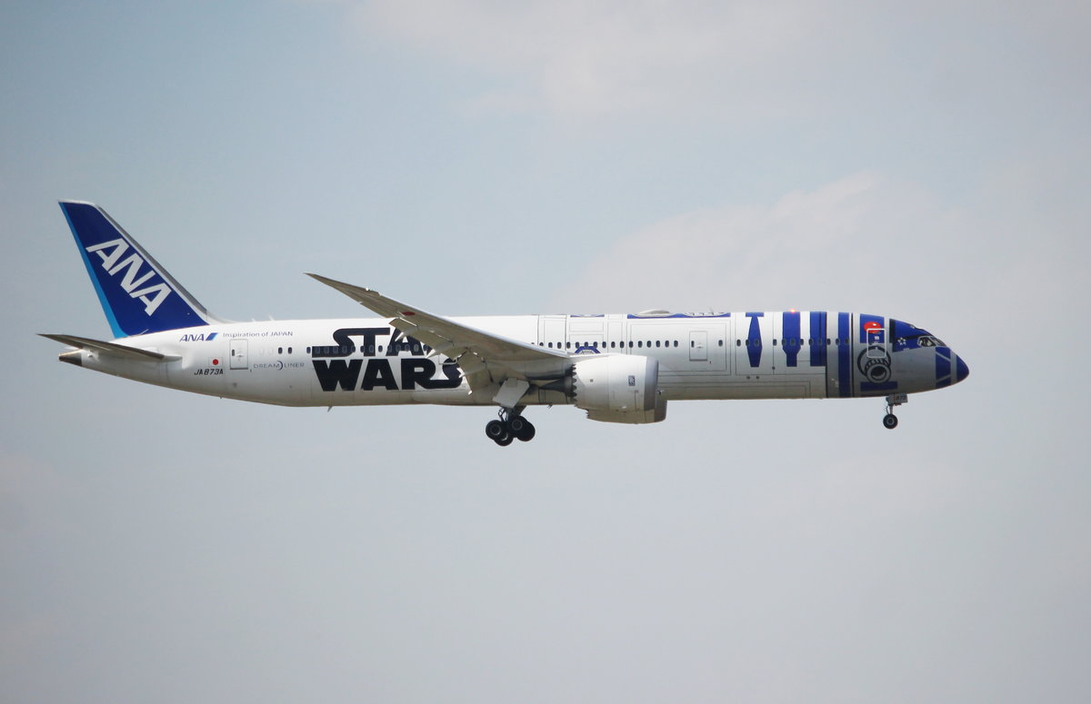 R2D2 Dreamliner JA873A der japanischen ANA beim Anflug auf Düsseldorf im Sommer 2017