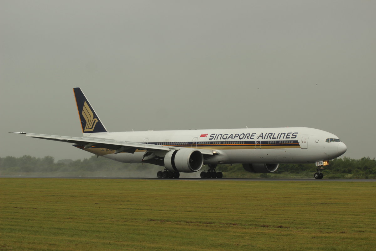 B777-300 9V-SWO aus Singapur bei der Landung im verregneten Manchester am 28.6.14