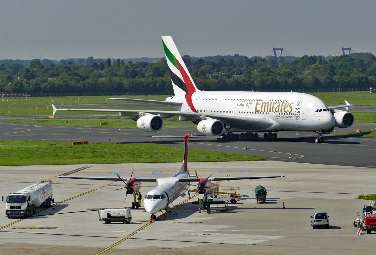 "David und Goliath" in Düsseldorf. A 380-800 Emirates und Bombardier DHC-8-402 Air Berlin im Größenvergleich - DUS 29.08.2017