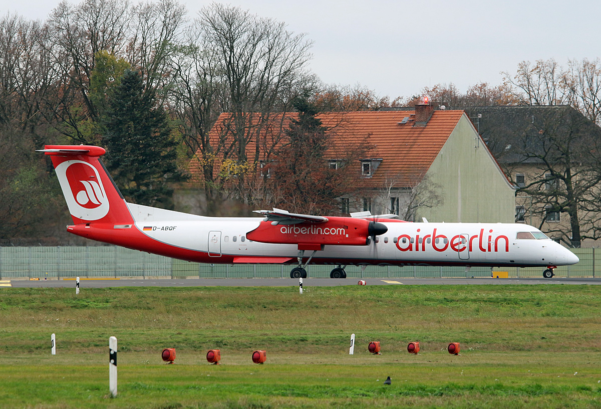 Bombardier DHC-8-402 Q 400 der Air Berlin, D-ABQL hinter`m Follow Me in DUS - 29.08.2017