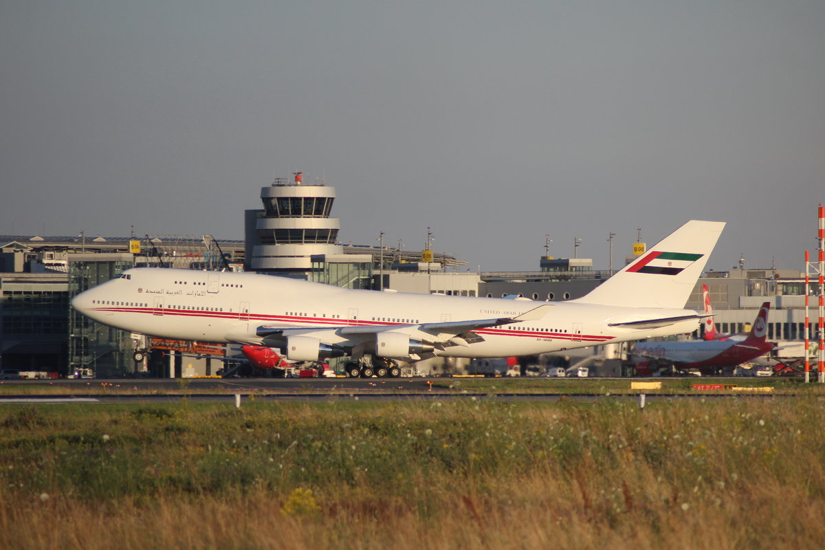 B747-400 A6-MMM der Dubai Air Wing bei der abendlichen Landung in Düsseldorf am 19.7.16