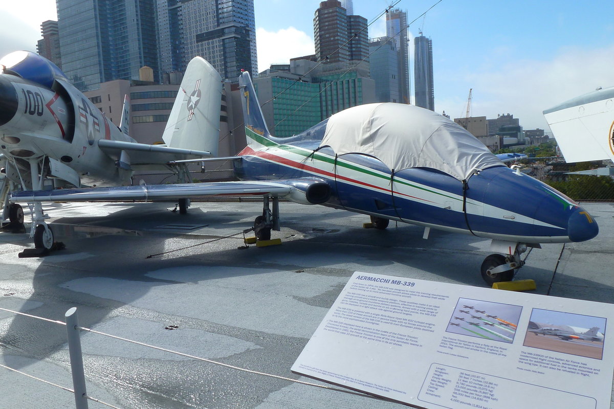 Aermacchi MB-339A, Serien-Nr. MM54439. Trainingsflugzeug der italienischen Luftwaffe in den Farben der 'Frecce Tricolore'. Intrepid Sea, Air & Space Museum, New York-Manhattan. Aufnahmedatum: 26.09.2018.