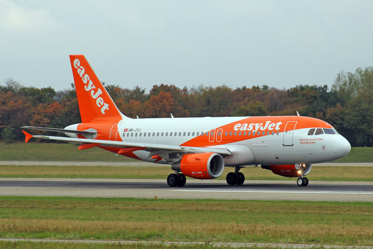 easyJet Switzerland, HB-JYJ, Airbus A319-111, msn: 4717, 03.September 2018, BSL Basel-Mülhausen, Switzerland. "Spirit of easyJet 2016, Team Brussels".