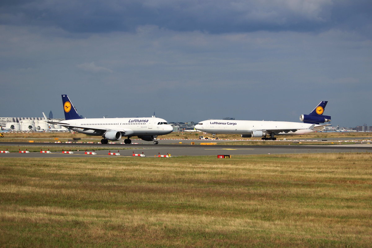 Ein A320 D-AIUO mit Sharklets der Lufthansa beim Start in Frankfurt, im Hintergund befindet sich eine MD-11F D-ALCN der Lufthansa Cargo auf dem weg zum Line-up der Startbahn West. Die Aufnahme entstand am 6.8.16