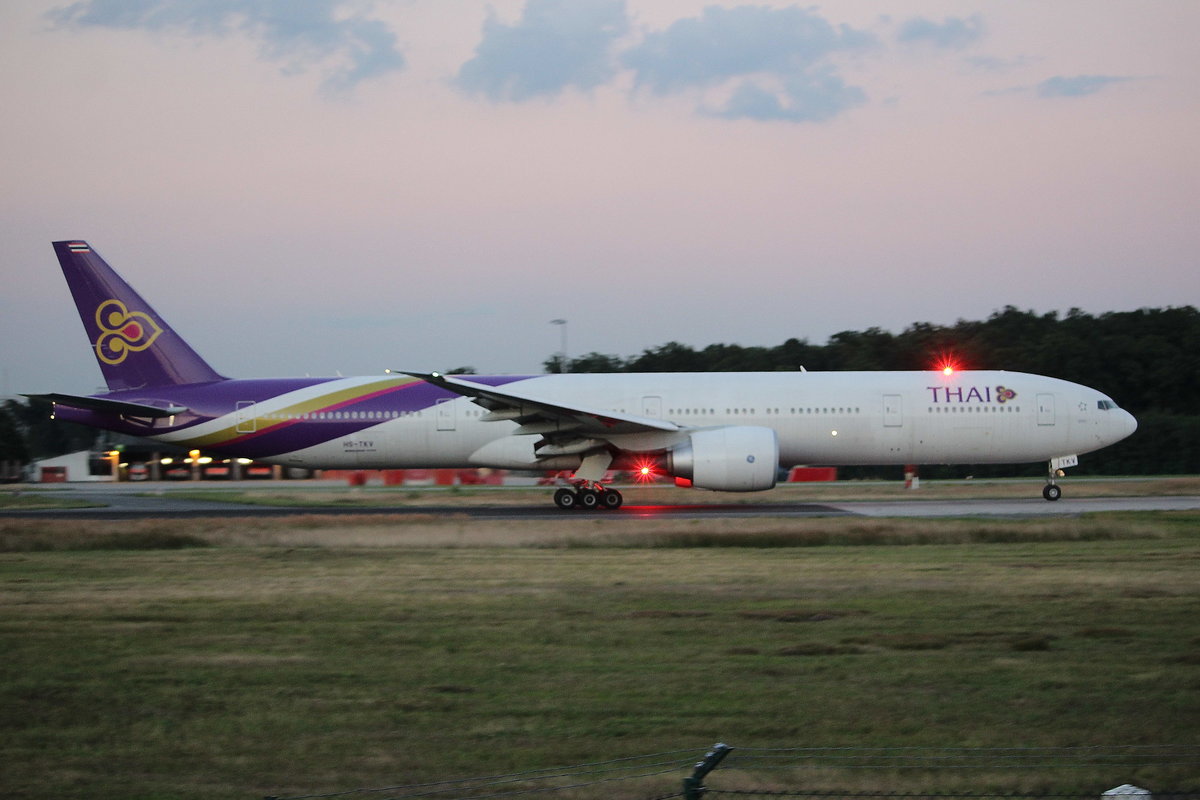 Eine Thai B777-300 mit der Registrieung HS-TKV beim Start auf der Startbahn West am Abend des 6.8.16 in Franfurt auf dem Heimweg nach Bangkok