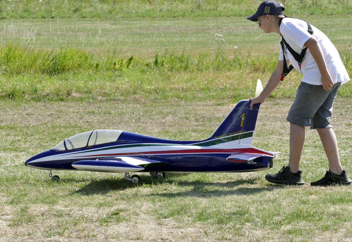 Flugmodell einer Aermacchi MB 3394 der "Frecce Tricolori" beim Wiesenfest am Flugplatz Müggenhausen - 02.09.2018