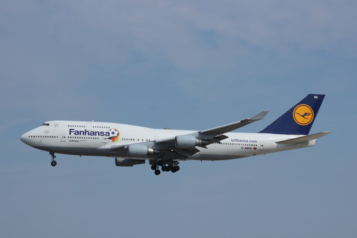 Zur Fußballweltmeisterschaft in Brasilien gab es diverse Maschinen der Lufthansa mit besonderer Beklebung, dazu gehörte auch diese Boeing 747-400 D-ABVK. Am 28.7.14 befand sich diese im Anflug auf die Bahn 25R in Frankfurt.