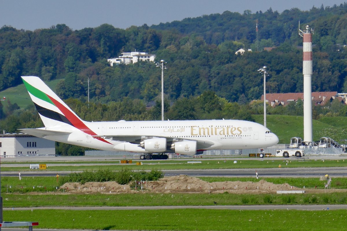 A380-861 (A388) A6-EUC Der Emirates nach dem Start am 15.9.18 in Zürich.