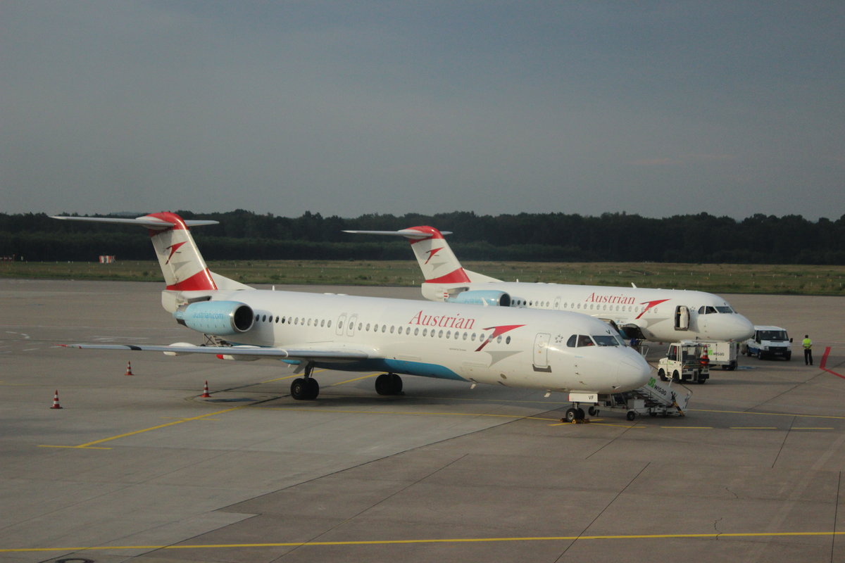 Eine Fokker F100 OE-LVF der Austrian Airlines zusammen mit ihrer kleineren Schwester der F-70 beim Boarding in Köln/Bonn Flughafen am 29.7.2014