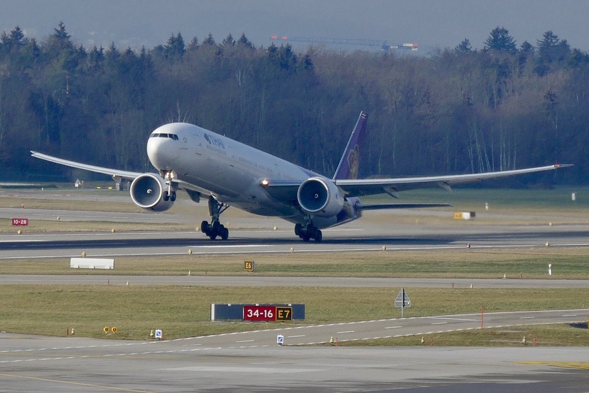 B777-3D7(ER) HS-TKX der Thai Airways beim Start am 19.1.19 in Zürich.