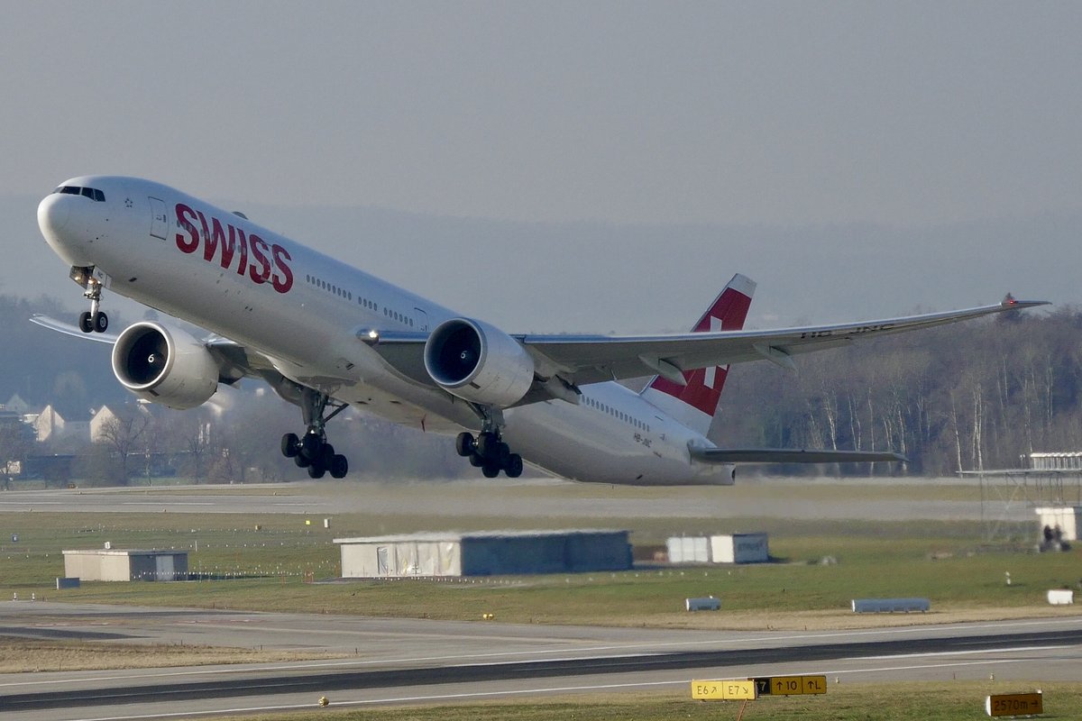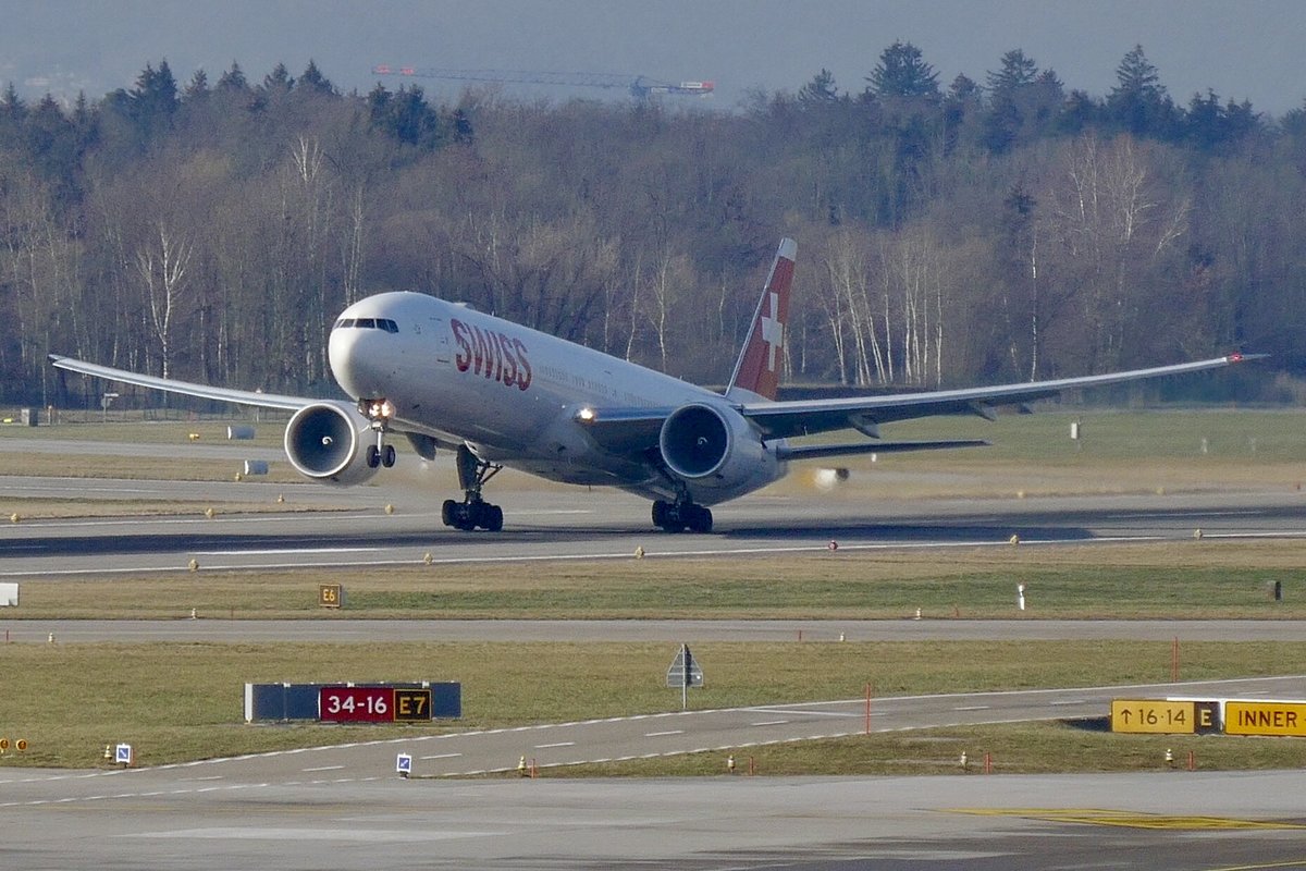 Swiss B777-3DE(ER) HB-JNC nach dem Abheben am 19.1.19 in Zürich.