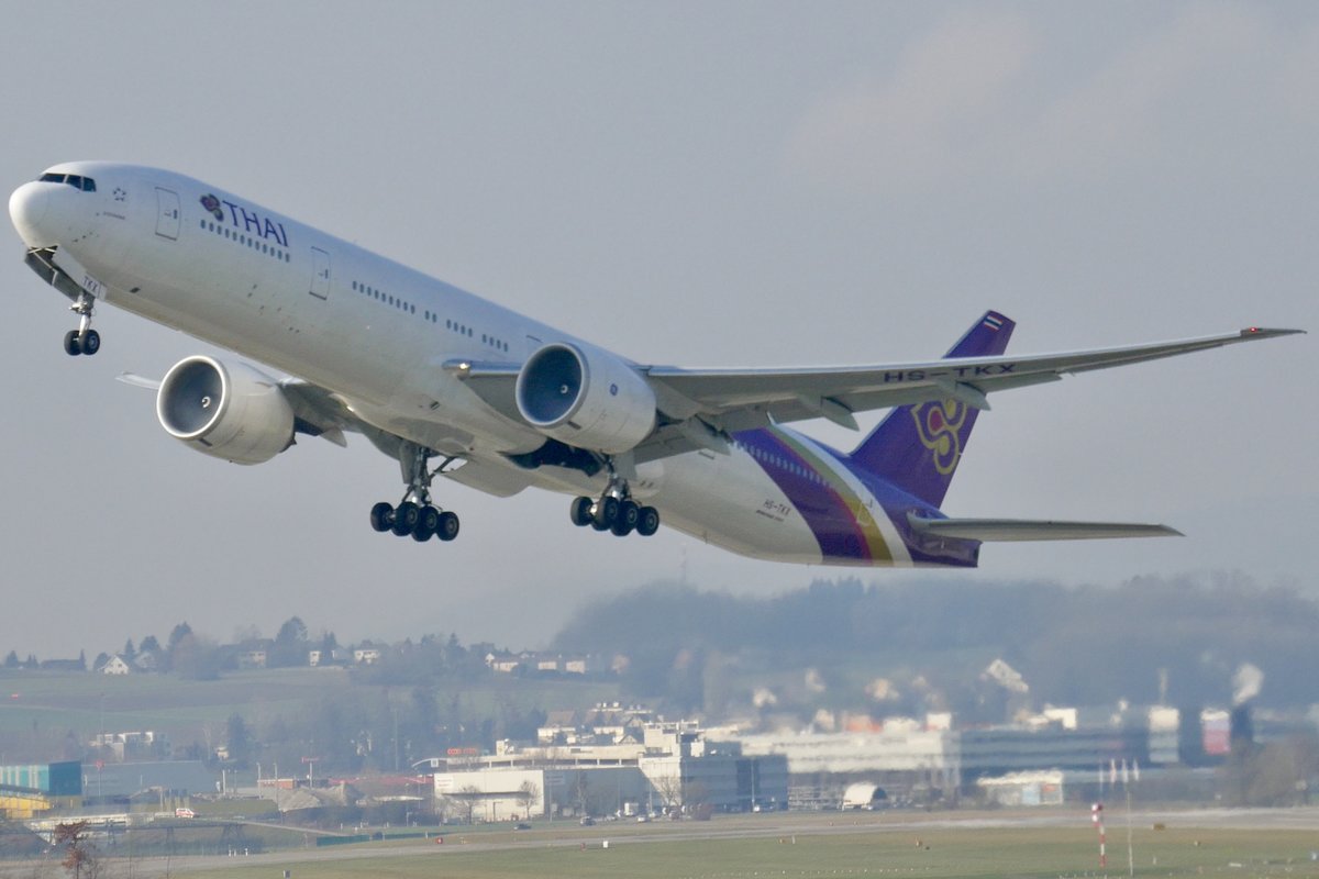 Thai Airways B777-3D7(ER) HS-TKX nach dem Abheben am 19.1.19 am Flughafen Zürich.