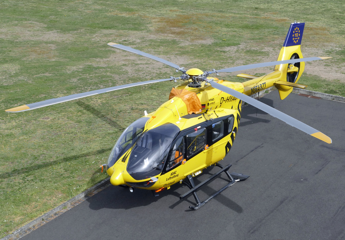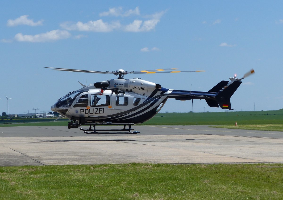Eurocopter EC-145, D-HTHD, Polizei Thüringen bei der Landung auf der Tankplatte auf dem Flugplatz Gera (EDAJ) am 30.5.2019