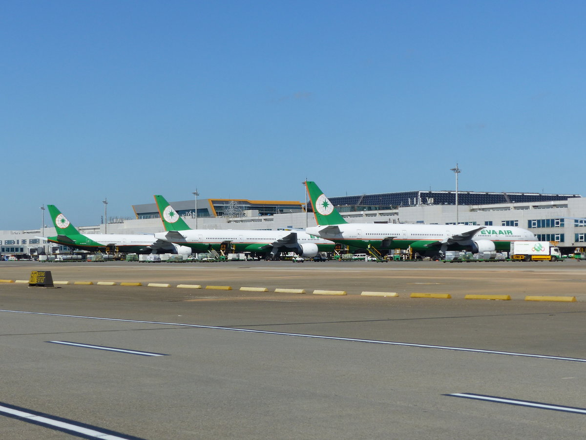 3mal EVA Air, Boeing 777-35E (ER) am Gate in Taoyuan (TPE) am 12.9.2019