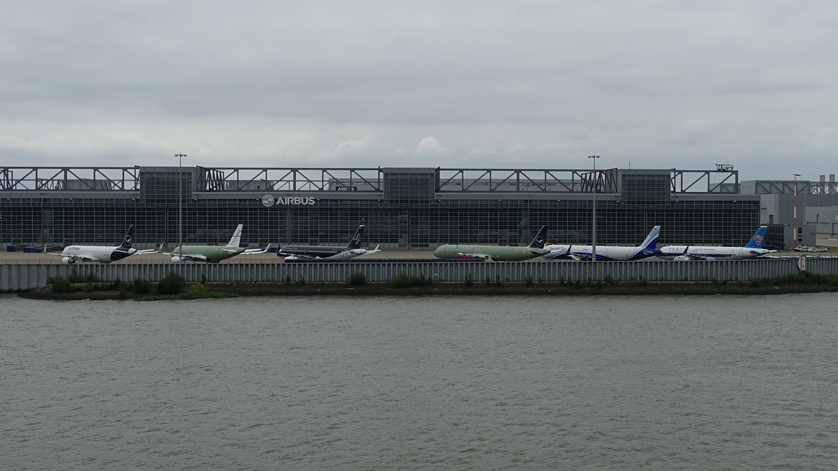 Hamburg am 14.7.2019: Blick von Bord der CAP SAN DIEGO auf das Airbus Werksgelände /