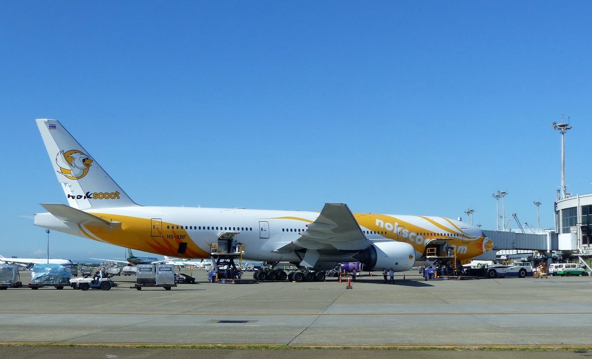 NokScoot, Boeing 777-212 (ER), HS-XBF am Gate auf dem Taoyuan Taipei International Airport (TPE) am 12.9.2019