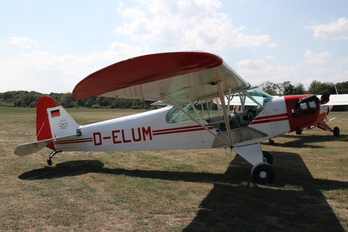 Privat, Piper J-3C-65 Cub, D-ELUM. Flugplatzfest 60 Jahre Flugplatz Leverkusen Am Kurtekotten (EDKL), 31.08.2019.